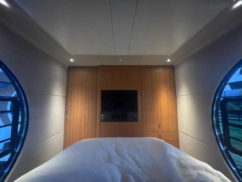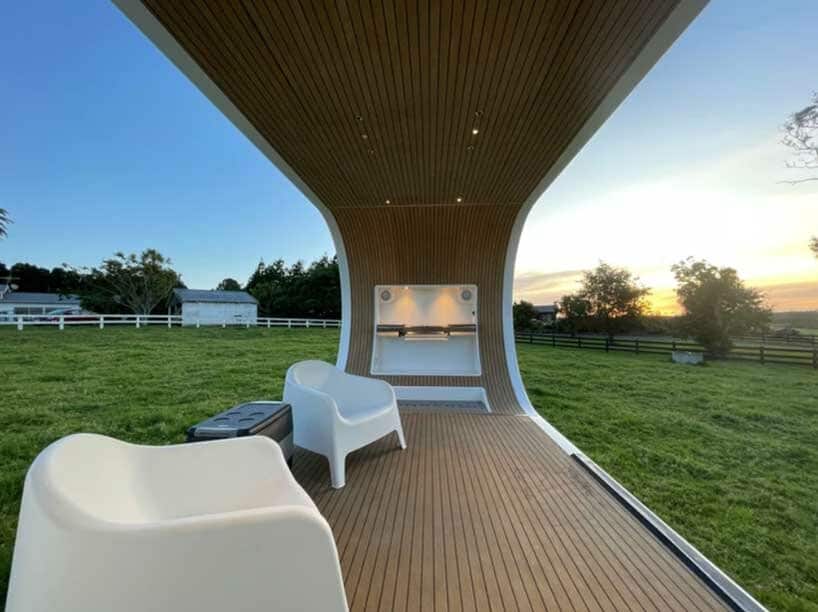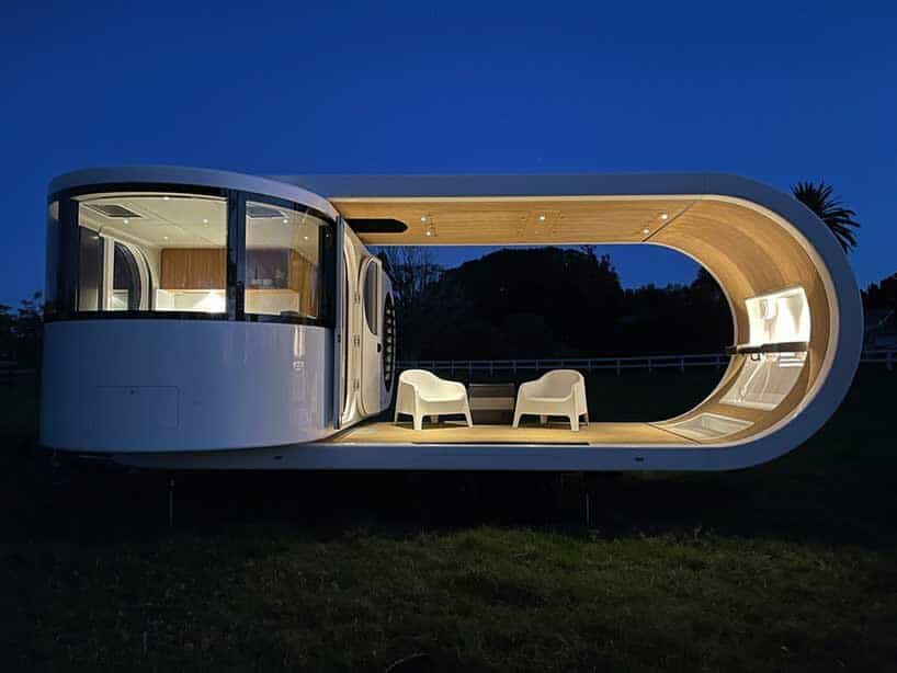 Upon arrival, the cabin swivels outwards by 90 degrees, creating a spacious two-part area that includes a generous covered deck and a main cabin that can accommodate four to six individuals. An automated hydraulic system powers the cabin’s outward extension and rotation.